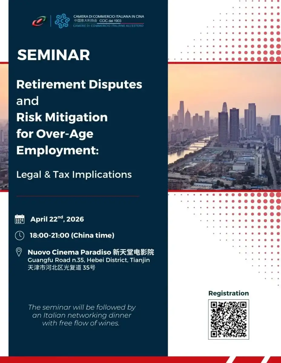 The Italian Chamber of Commerce in China (CCIC) is delighted to invite you to the upcoming seminar, delving into a critical topic for HR, Legal, and Finance professionals - “Retirement Disputes and Risk Mitigation for Over-Age Employment: Legal & Tax Implications” on 22nd April in Tianjin at Nuovo Cinema Paradiso, a landmark venue in the city’s Italian-style district.