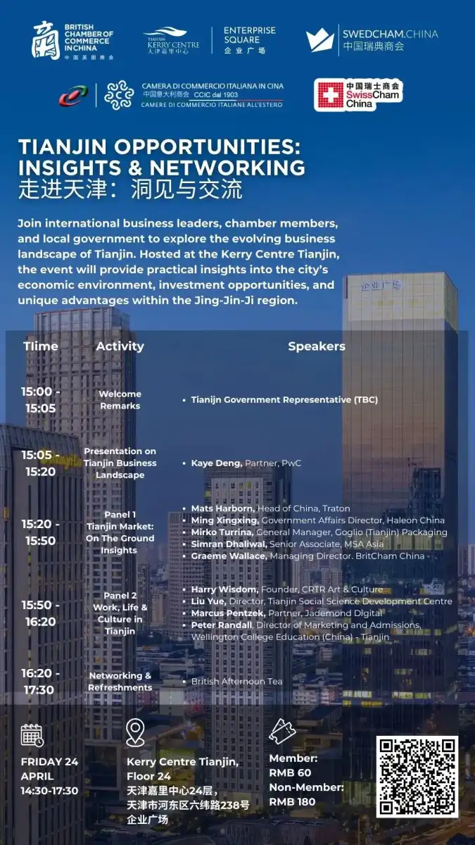 The Italian Chamber of Commerce in China (CCIC) in collaboration with the British Chamber of Commerce in China, the Tianjin Kerry Centre, the Swedish Chamber of Commerce in China and the Swiss Chamber of Commerce in China is glad to invite you to the event “Tianjin Opportunities: Insights & Networking” to be held on Friday, April 24th, 2026 at the Kerry Centre Tianjin starting from 15:00.