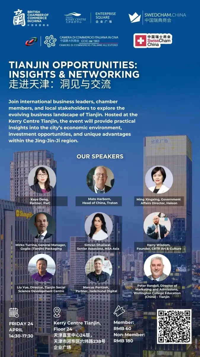 Join us at Kerry Centre Tianjin for an evening of insights and networking with international business leaders, chamber members, and government representatives. Together, we’ll explore the city’s evolving economic landscape, emerging investment opportunities, and its strategic role within the Jing-Jin-Ji region.
